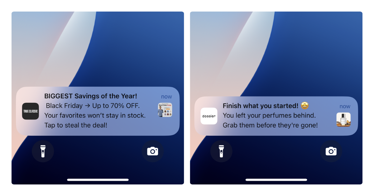 They’re the perfect channel for a lot of user cases: product drops, flash sales, back-in-stock alerts, loyalty rewards, and abandoned cart recovery.