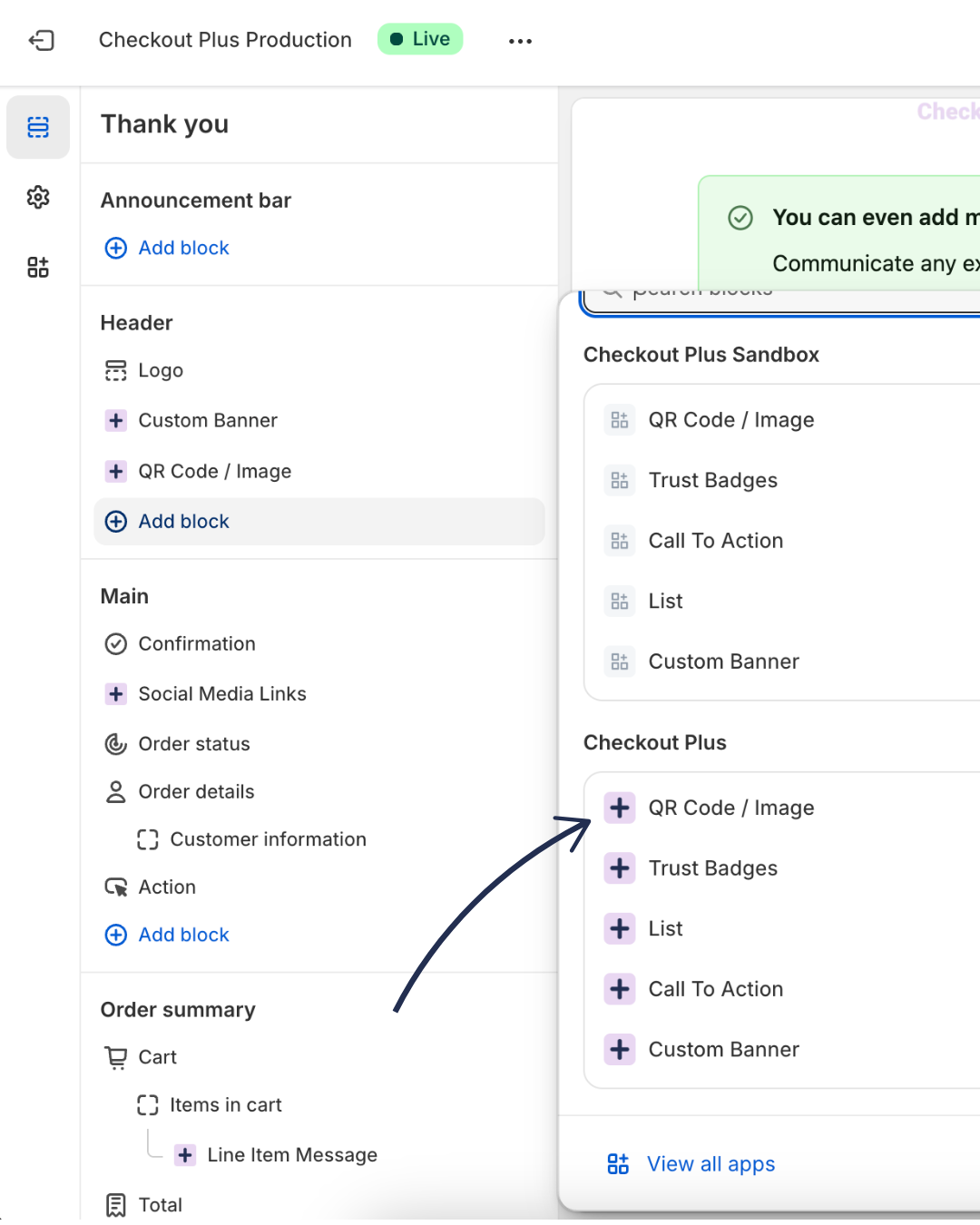 If you need to add a QR Code to your Shopify checkout or after your checkout on the Thank you or Order Status pages. Here is a quick no code solution that you can have set up in less than 5 minutes using the Checkout Plus App.